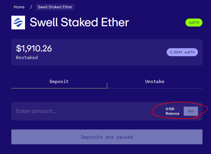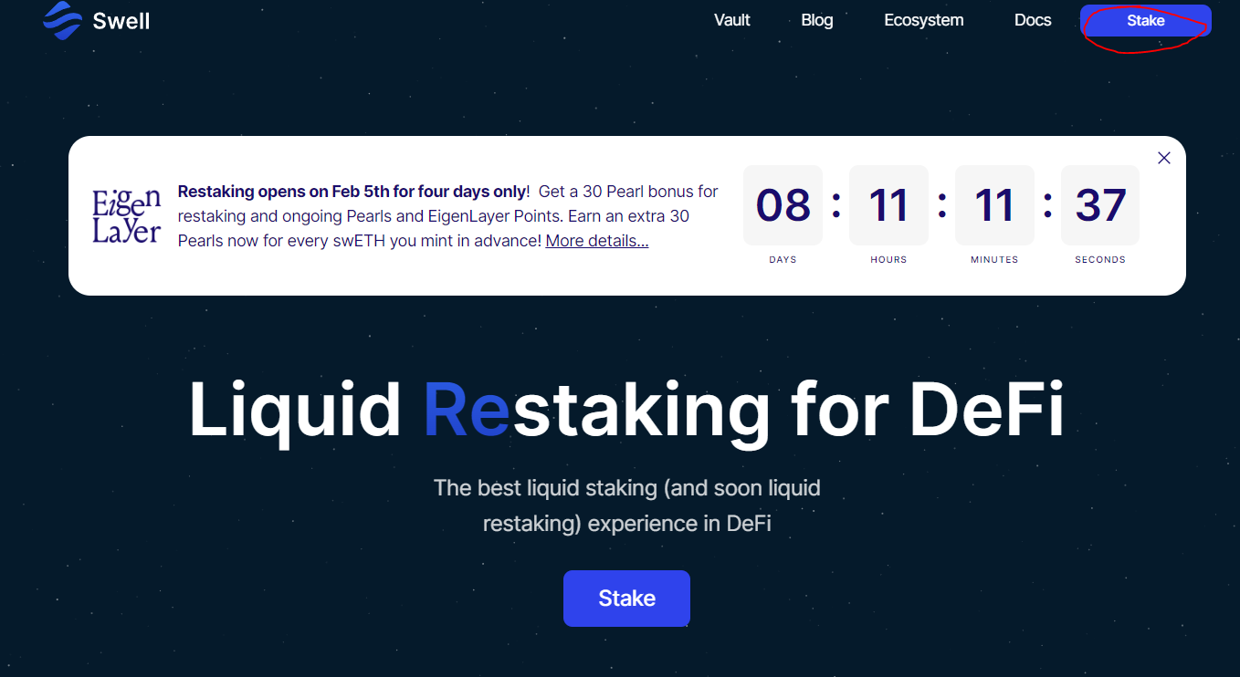 ETH를 예치하게 되면 swETH를 획득할 수 있는 LRT를 제공하는 예치사이트입니다.
