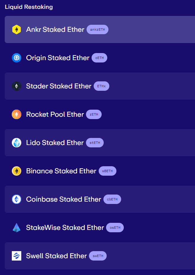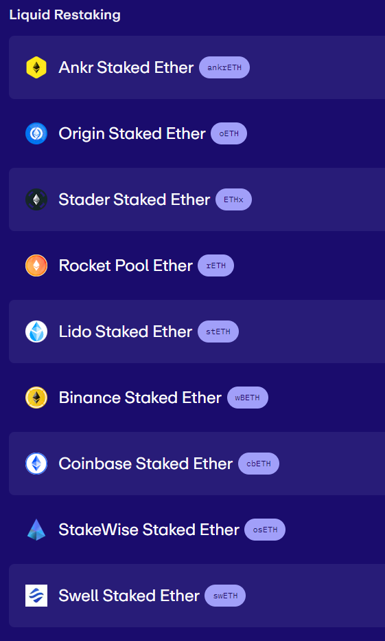 에이건레이어에 예치할 수 있는 LRT가 어떤 것들이 있는지부터 살펴보겠습니다.