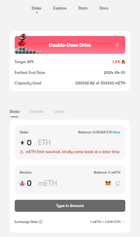 아무튼 하는 방법은 아까의 Swell과 똑같이 ETH를 넣어서 mETH를 획득해주시면 됩니다.