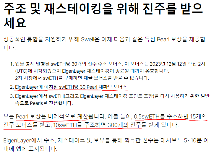 그리고 ETH를 예치해서 swETH를 얻을 때에만 Pearl을 획득하는 것 외에도 EigenLayer에 예치시 추가 보너스까지 주는 것 때문에 꼭 Swell에 예치한 뒤에 EigenLayer 풀에도 예치를 하는 것을 강력히 말씀드리는 부분이기도 합니다.