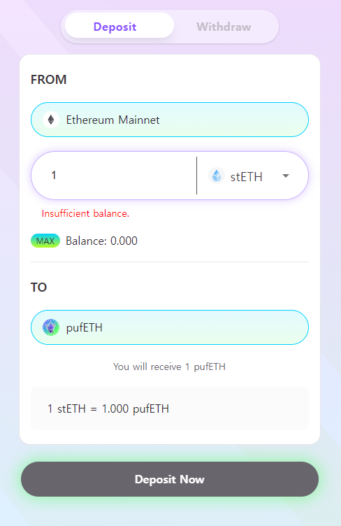 아래의 Deposit Now를 눌러주시면 pufETH가 들어오고 끝날겁니다!