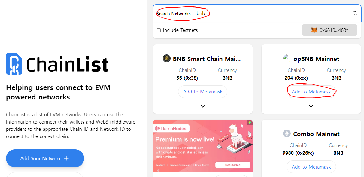 그 다음 원하는 체인을 검색하신 뒤, Add to Metamask를 눌러주시면