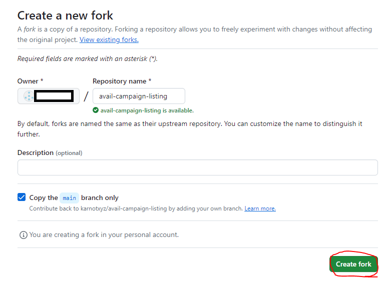 뭐 안하시고 바로 우측 하단의 Create Fork를 눌러주세요.