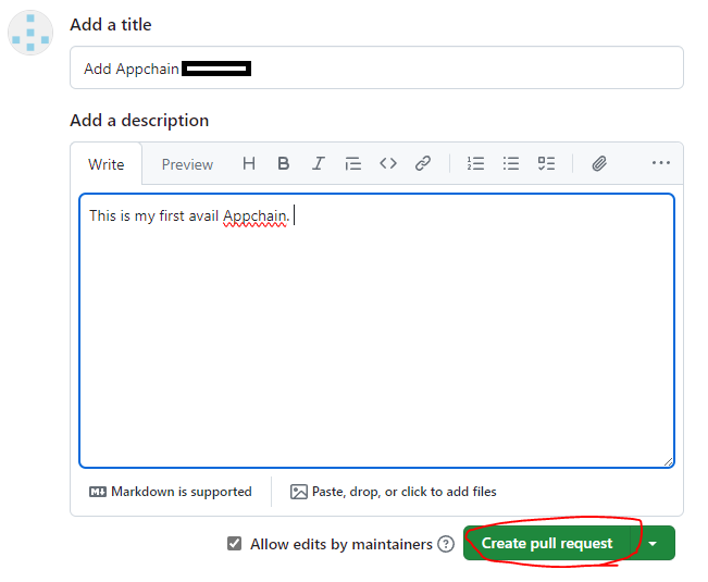 대충 제목은 "Add AppChain 내 앱체인 이름”, 설명엔 “This is my first Avail AppChain” 이런식으로 작성해주시고 하단의 Create pull request를 눌러주시면 됩니다.