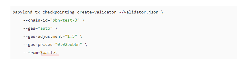 babylond tx epoching delegate $(babylond keys show wallet --bech val -a) 1000000ubbn --from wallet --chain-id bbn-test-3 --gas-adjustment 1.2 --gas 500000 --fees 10ubbn -y