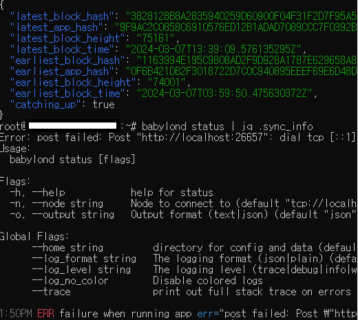 라는 생각과 함께 위와 계속 jq .sync_info 치다보면 또 위와 같은 에러가 나타나고 있을거에요.