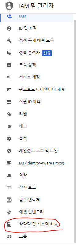다시 왼쪽 보시면 할당량 및 시스템 한도라고 있는데 여길 눌러주세요.
