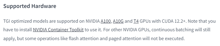Heurist의 노드를 돌릴 때 필요한 TGI가 지원되는게 위에 나오듯이 Nvidia A100, A10G, T4라고 하는데요.