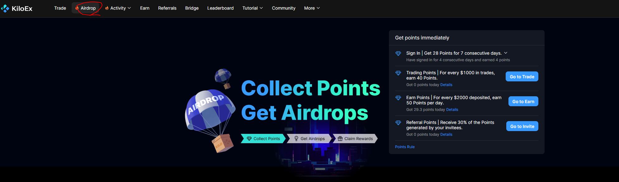 현재 KiloEx는 포인트를 채굴할 수 있는데요.
