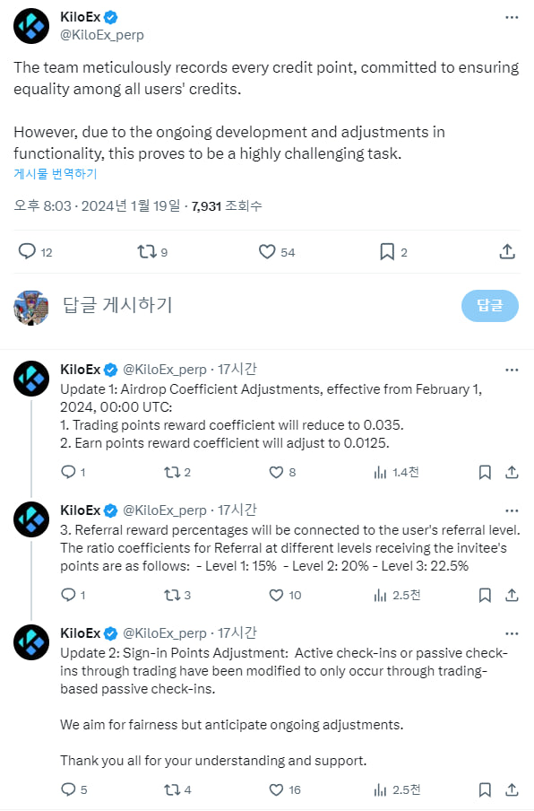 1월 19일 갑자기 KiloEx 측에서 포인트 리워드 정책을 변경한다고 공지를 올렸습니다.