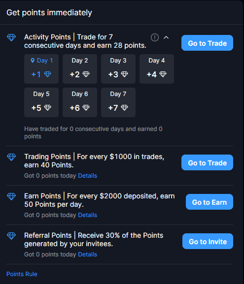 트레이딩 포인트를 보면 매일 $1000를 트레이딩하면 40포인트를 얻는다고 나와있습니다.