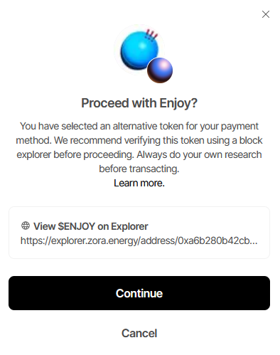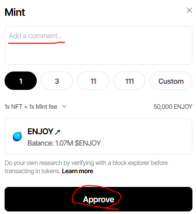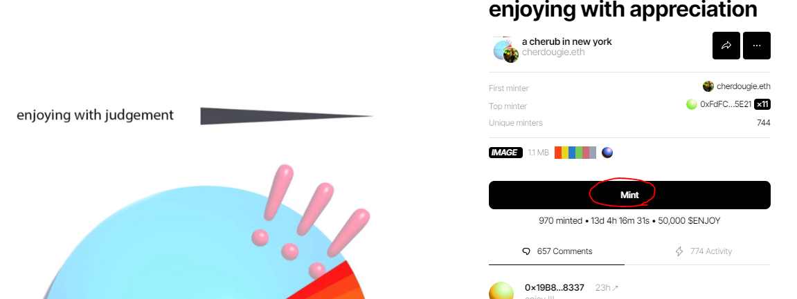 - Zora체인에서 $enjoy를 이용해 NFT를 민팅한다.($enjoy로 민팅가능한 NFT가 따로 존재함)