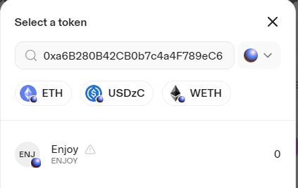 Search name or paste address부분에 아까의 $ENJOY의 토큰 컨트랙트를 붙여넣어주시면