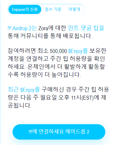!!! Airdrop 2 will be distributed via community through mint comment tipping on Zora. To participate, connect an account holding at least 500,000 $Enjoy and check your weekly tip allowance. The more active you are onchain, the higher your allowance will be